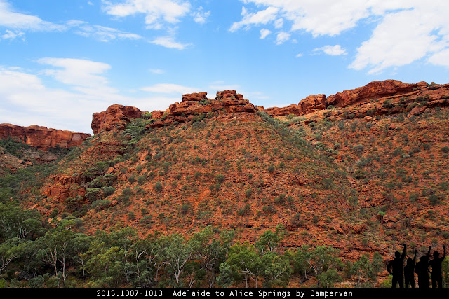 露營車旅行的倒數第二天,我們即將前往位於烏魯魯與愛莉絲泉中間的國王峽谷(Kings Canyon),國王峽谷在烏魯魯(Uluru)東北方約300公里,離愛莉絲泉(Alice Springs)西南方約450公里,因為壯闊的峽谷及豐富的動植物而聞名,常有許多背包客參加旅行團或是自駕到此一遊。